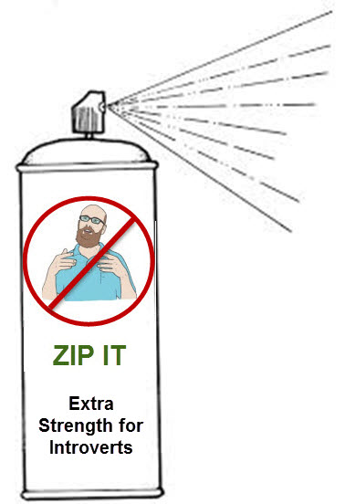ZIP IT – Extra Strength for Introverts® silences non-stop talking. Simply spray ZIP IT at the offending yakker. Then say what’s on your mind.